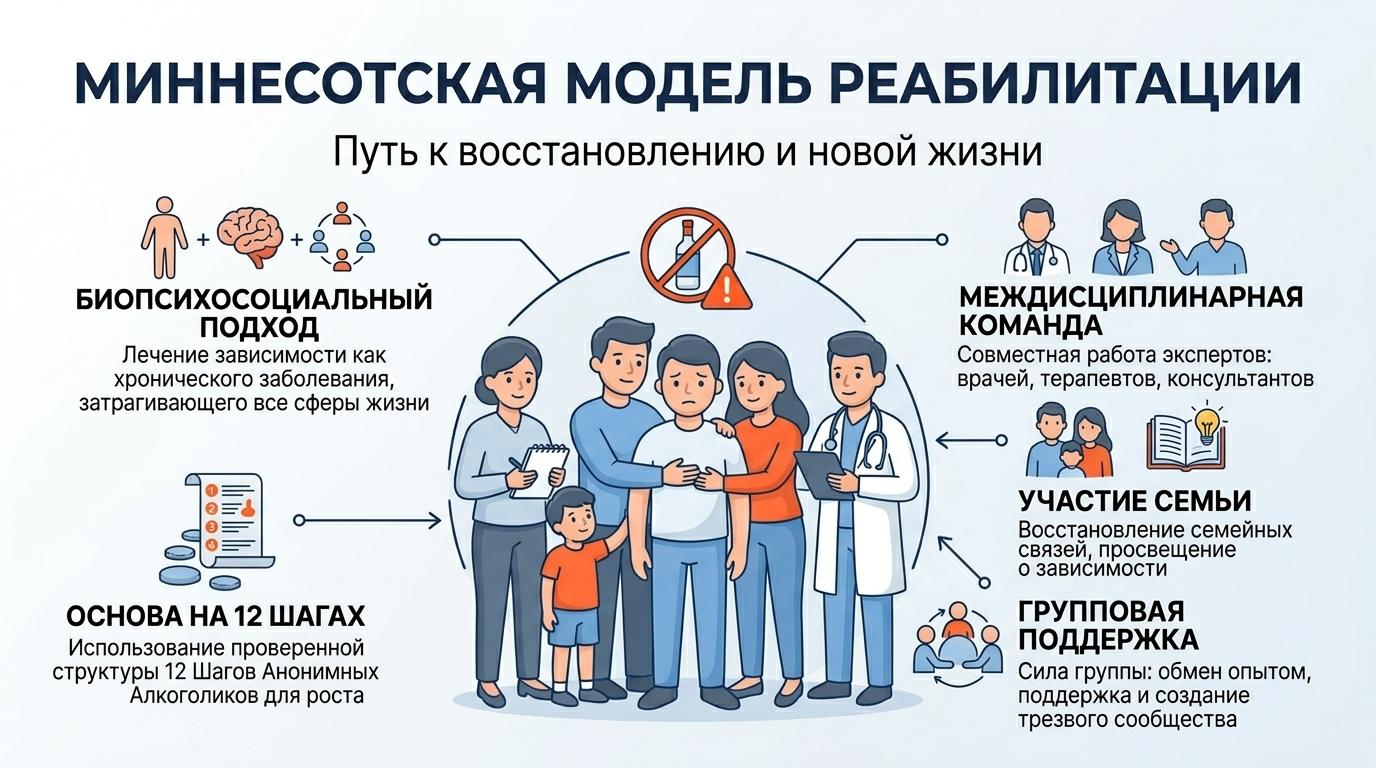 Миннесотская модель реабилитации – это целостная система, выстроенная не на страхе и запретах, а на понимании: зависимость – не моральный провал, а сложное взаимодействие биологии, психики и среды.