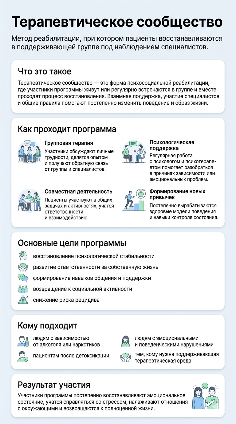 Это живая среда, где каждый участник одновременно и пациент, и активный член коллектива, где выздоровление происходит через взаимодействие, а ответственность, честность, поддержка и труд становятся не обязанностями, а инструментами внутренней перестройки.